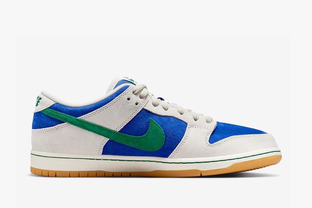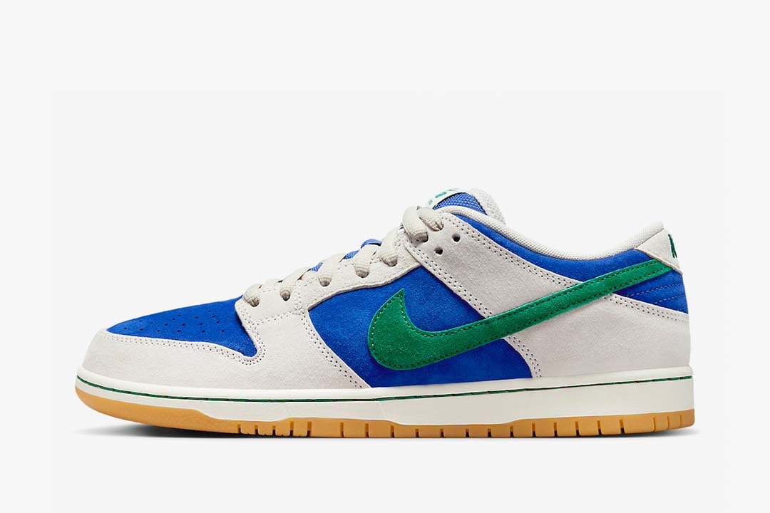 Not unlike another SB Dunk revealed in late 2023, this upcoming release is built with buttery suedes from front to back, simply relying on a refreshed color-blocking scheme to do the heavy lifting. Royal Blue and a Malachite Green pair up on the upper — the former sitting as the base later and the latter accenting the Swoosh logos and the heel-tab. Nike then relies on a neutral shade of Phantom on the overlay, while the white midsole and gum outsole complete the classic skate shoe look.