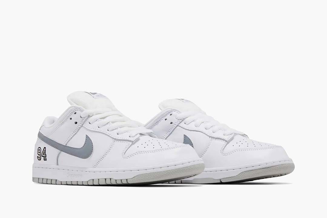 SB Dunk Low Supreme 94 White Metallic Silver – HQ8487-100